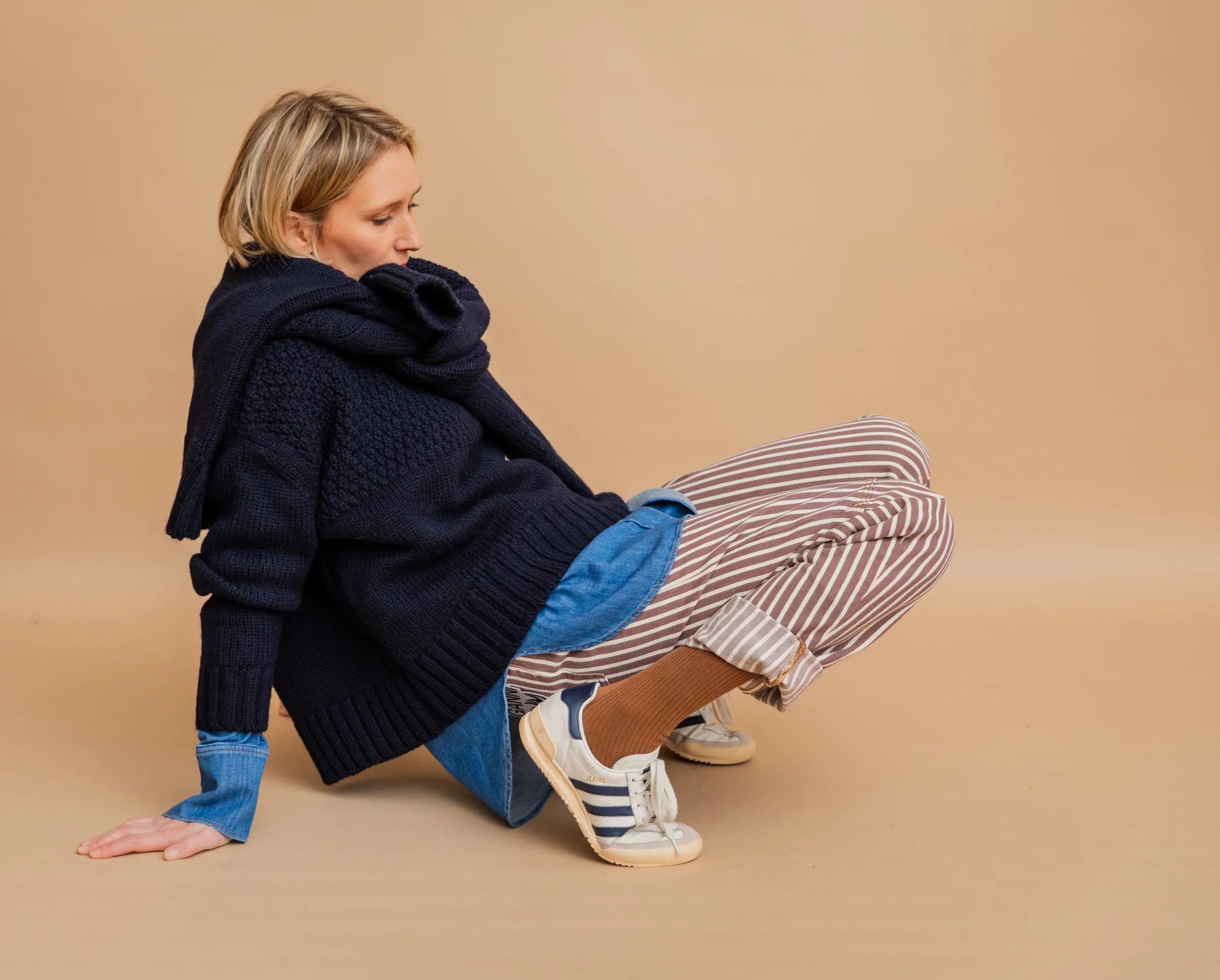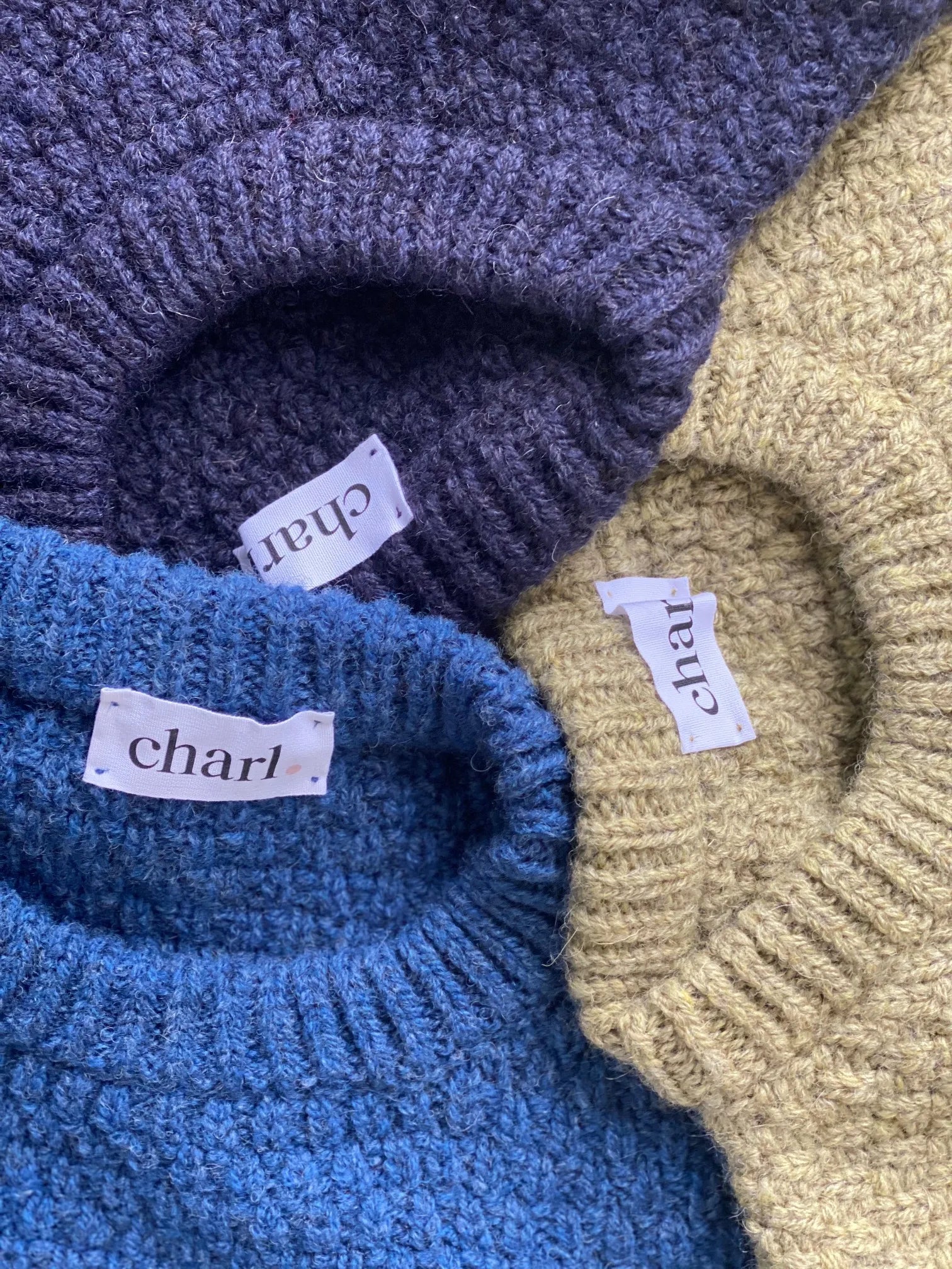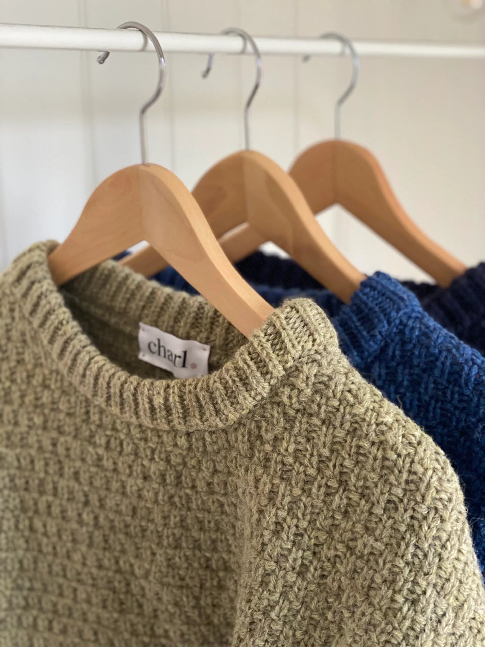 This knit comes in 3 sizes and two colours; True Navy Blue and Sage Green (more colours will arrive throughout the season). This piece can be worn by men or women, a cosy over-size go-to piece to pull on when the coastal breeze picks up. It is knitted with an open crew neck with a chunky folded rib trim. The top half of the body is knitted in the original “hailstone” stitch taken directly from the original Ganseys on both the front and back, with a neat central shoulder seam and chunky rib trims. The body is generous and boxy, flatteringly shaped upwards towards the front. The sleeves are slightly long and can be worn turned back with a ribbed cuff which can be pushed up to scrunch, or pulled down to cover the knuckles. Reverse knit panels run down each side seam – just like on the original Ganseys, this jumper is intentionally simple in pattern and form to complement the beauty of the stitches.