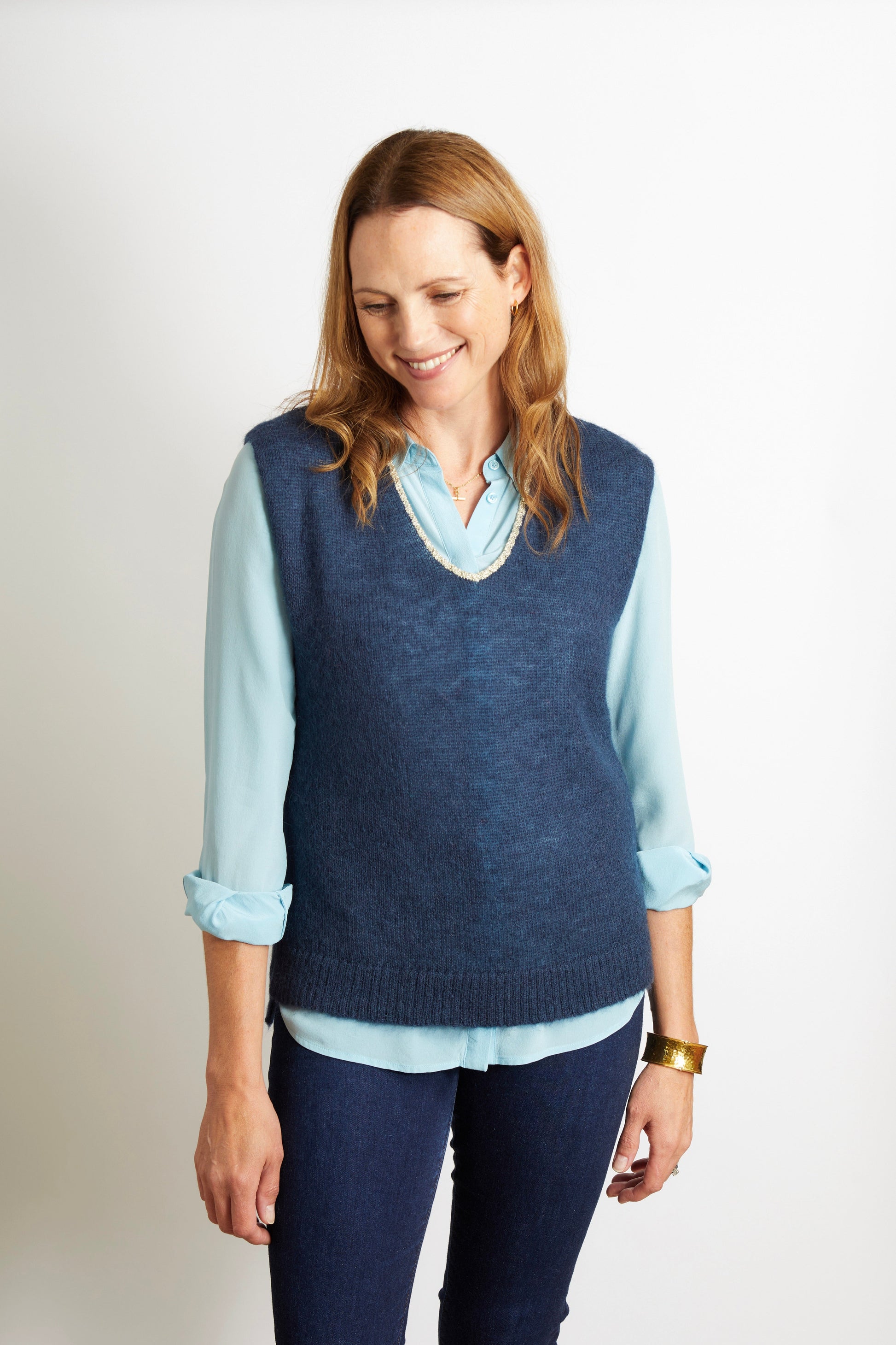 Nancy Knitted V Neck Tank Top with Champagne Sparkle Lurex Trim - Navy Blue